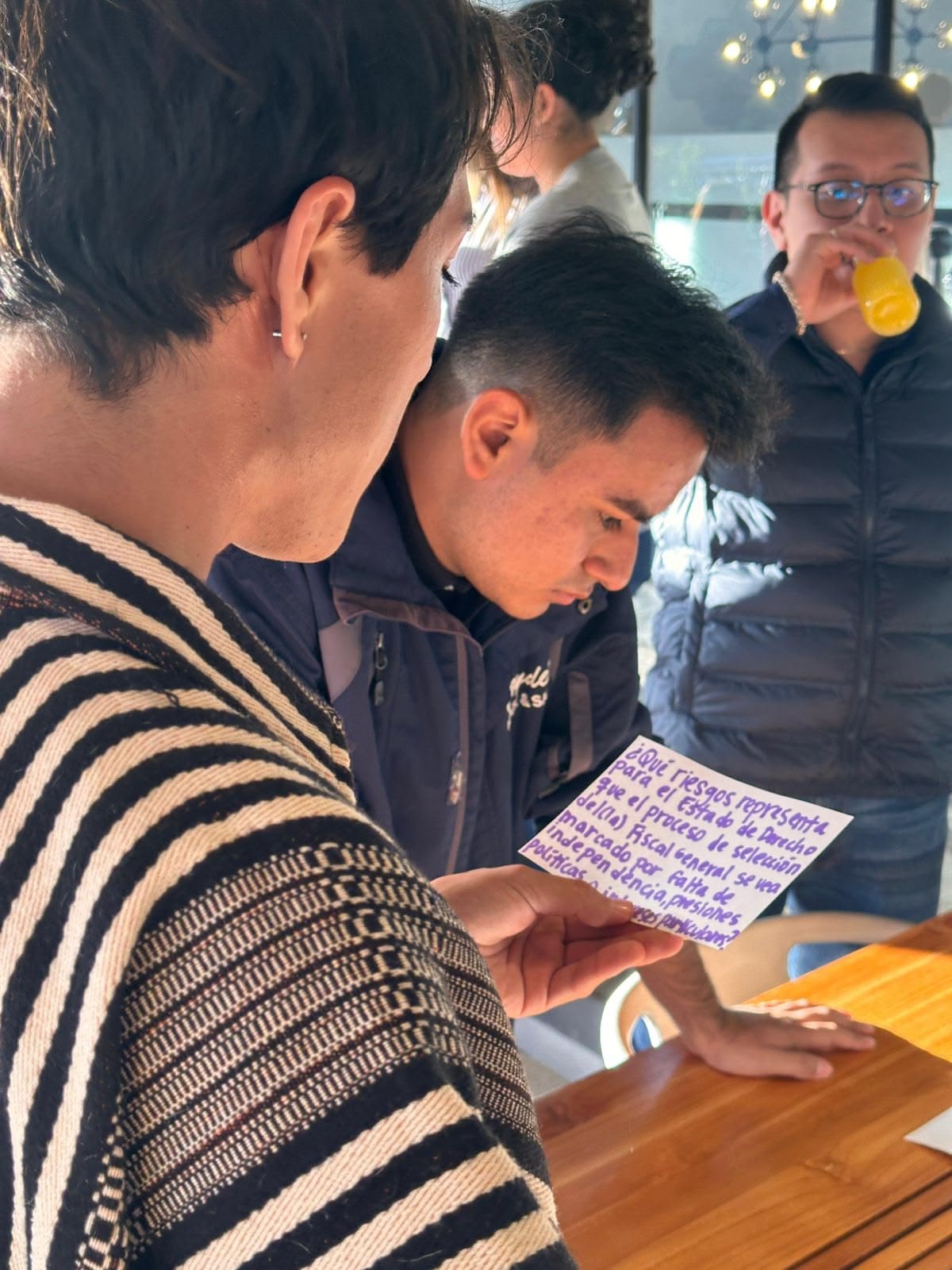 Durante el taller, se profundizó en las particularidades del proceso de selección, los actores involucrados, los requisitos legales y los momentos críticos que pueden definir su rumbo. También se analizó el entorno político y social que influye en esta elección, así como las consecuencias que tendría para el Estado de Derecho un proceso cooptado, politizado o alejado de las normas que lo rigen. La metodología combinó exposición, trabajo en grupos y discusión abierta, lo que permitió abordar a profundidad los aspectos técnicos, políticos y sociales que inciden en este proceso. Más de 20 participantes, en su mayoría estudiantes universitarios de Derecho y miembros de la sociedad civil, generaron un diálogo informado y plural que enriqueció el análisis colectivo.